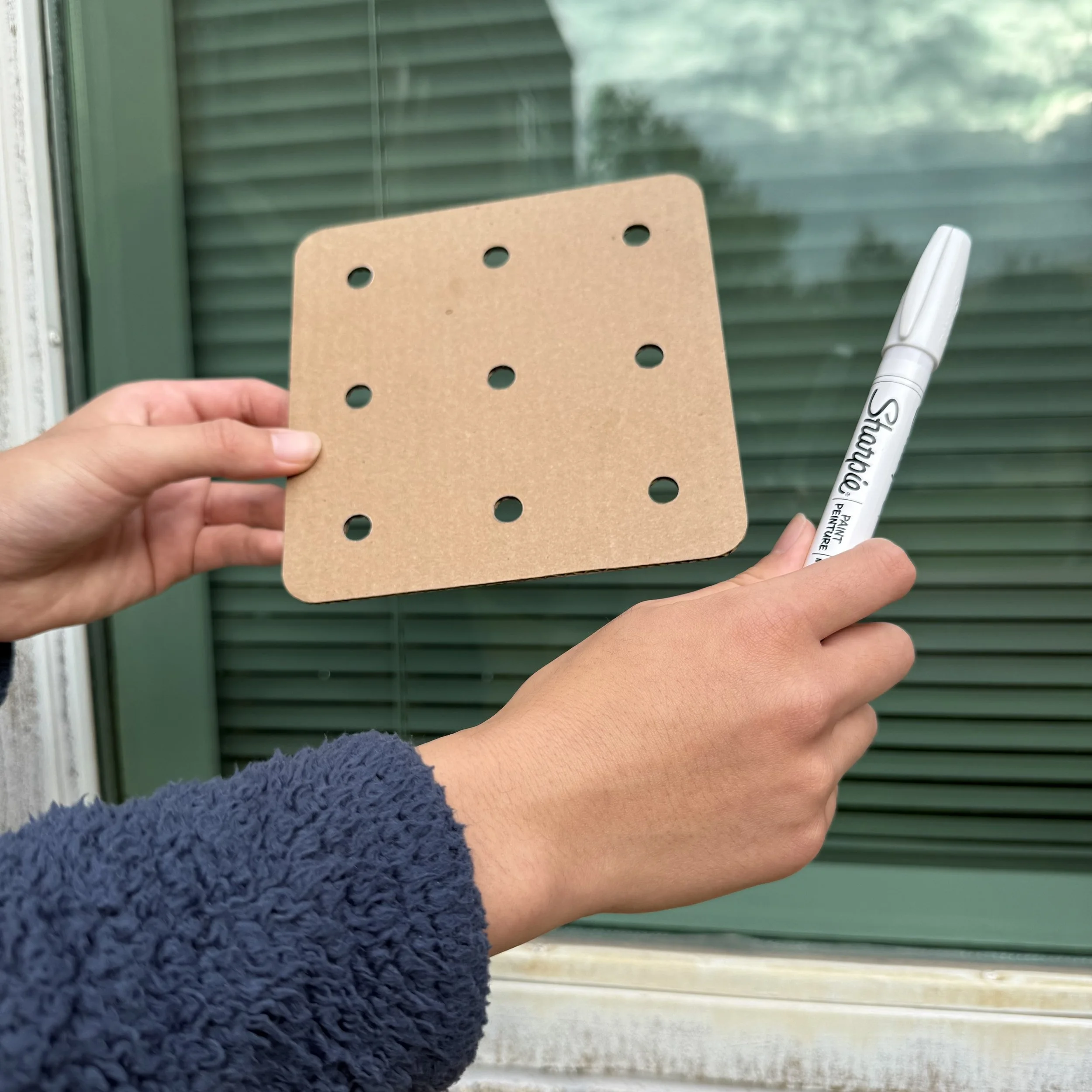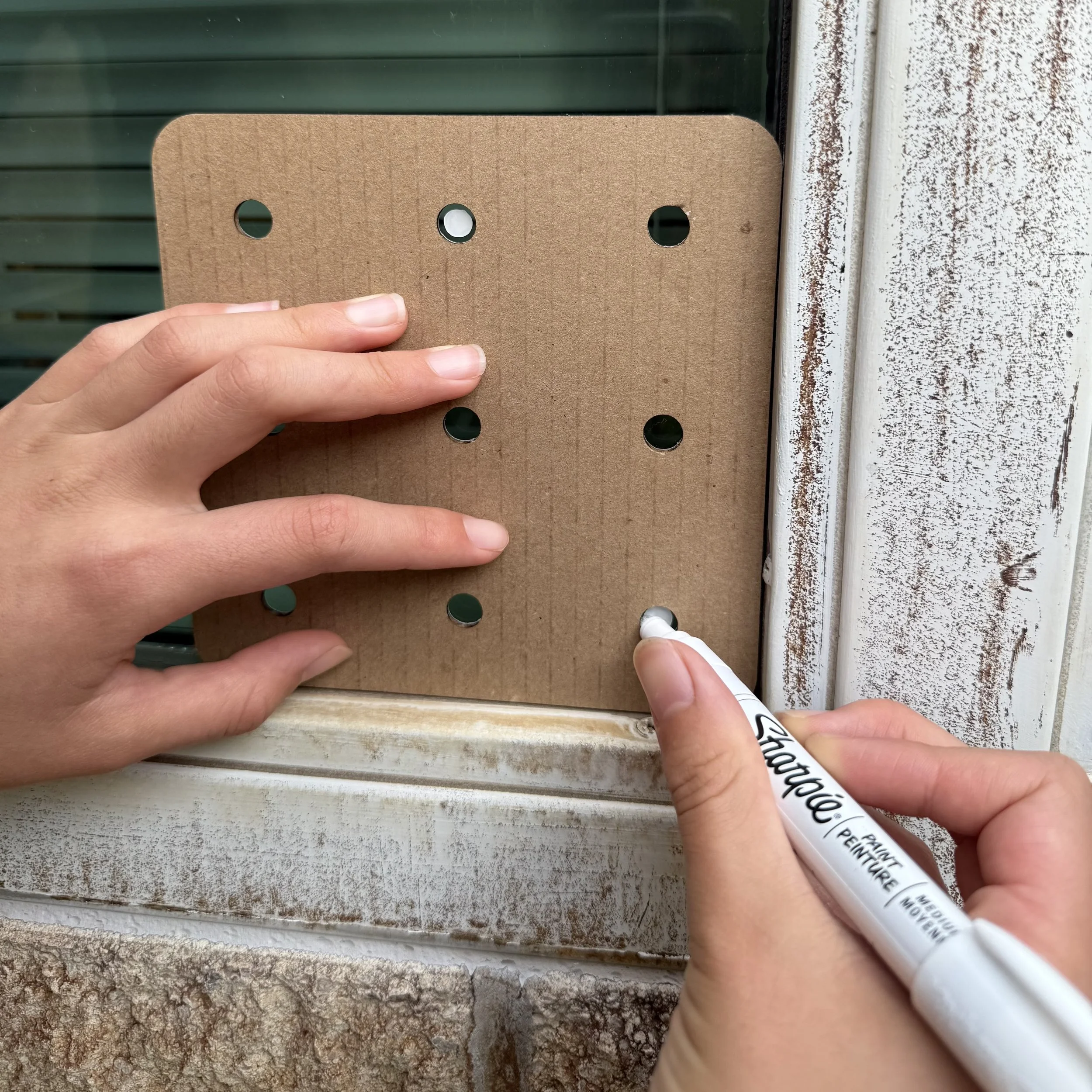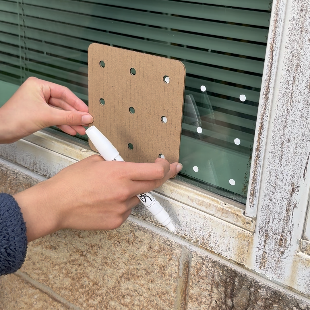 Align the template snugly into the bottom corner of your window to make sure it is square. Start painting the dots!