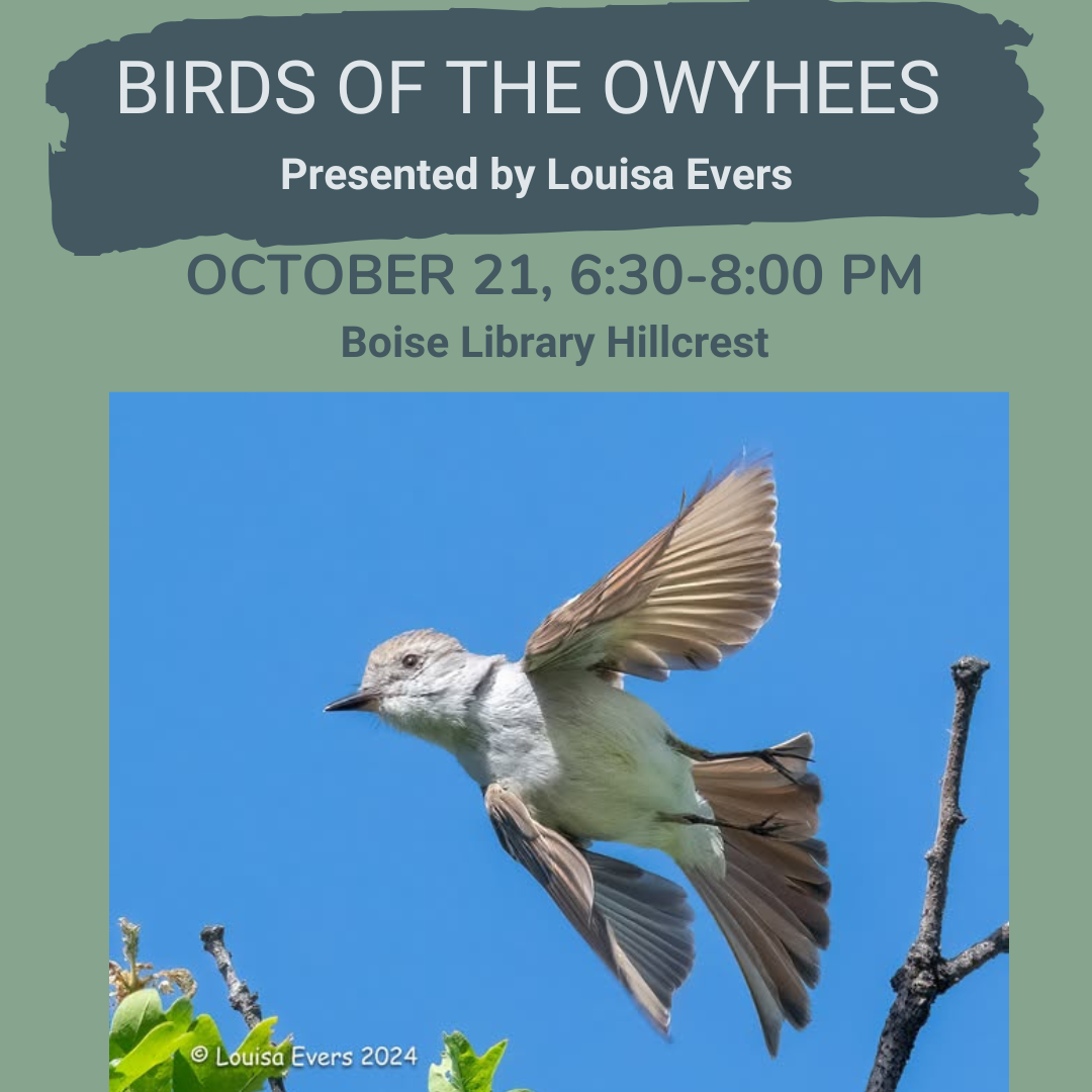 The diverse ecosystems and elevations of the Owyhee Mountains attract mountain and desert bird species. Louisa Evers will talk about the widespread and the rare species of Elmore, Malheur and Elko counties. You’ll learn what to look for at higher and lower elevations and at the wetlands and reservoirs.