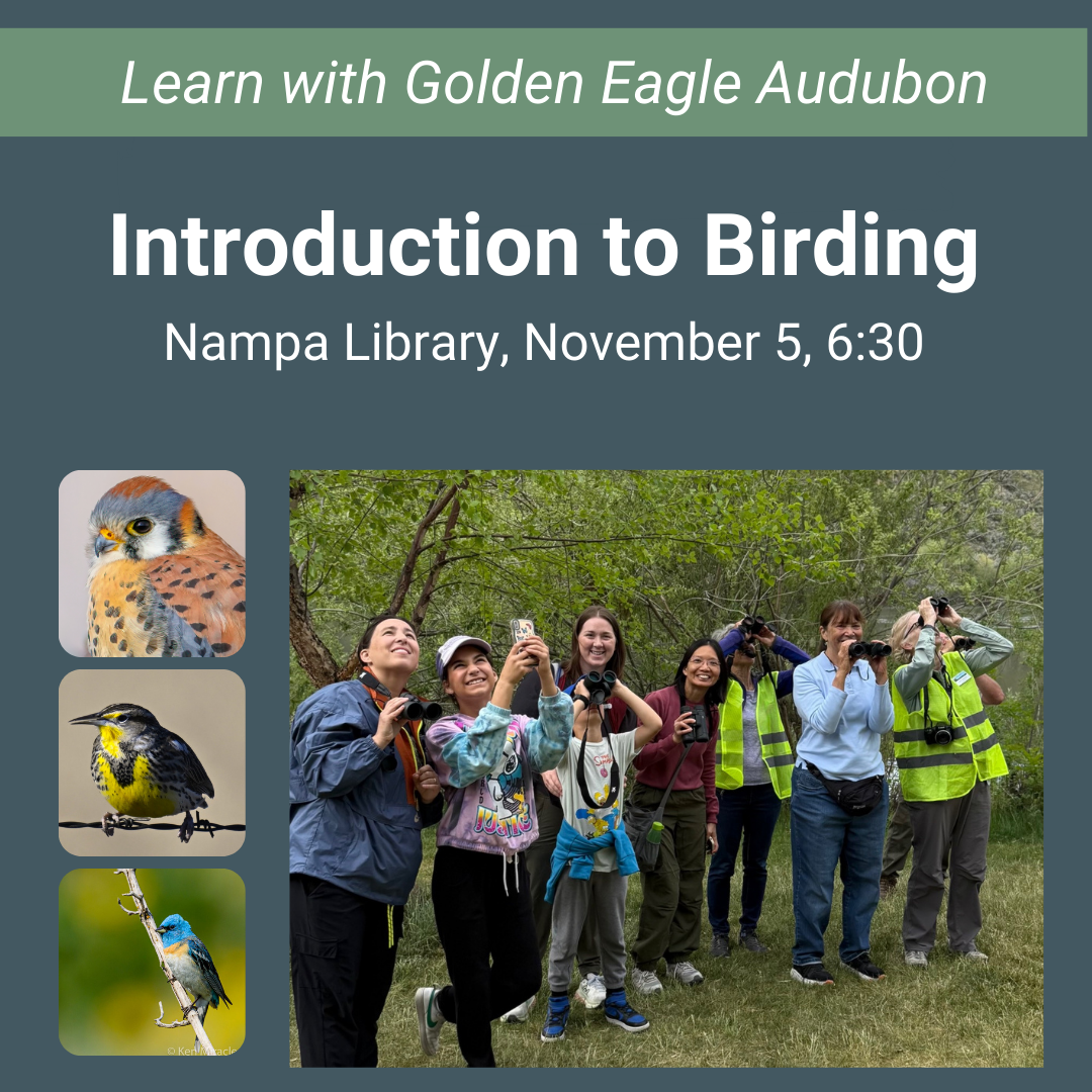 Birding is a fun, outdoor activity that people of all ages and abilities can enjoy, and it's easy to get started. In this class you'll learn about the birds you hear or see in your yard or on your walks. Identifying birds by their color, shape, behavior and sounds are covered in this class.  You’ll also learn about birding resources and gear. This class is perfect for beginning birders and anyone ready to learn more about birds. This class is taught by Golden Eagle Audubon volunteers.