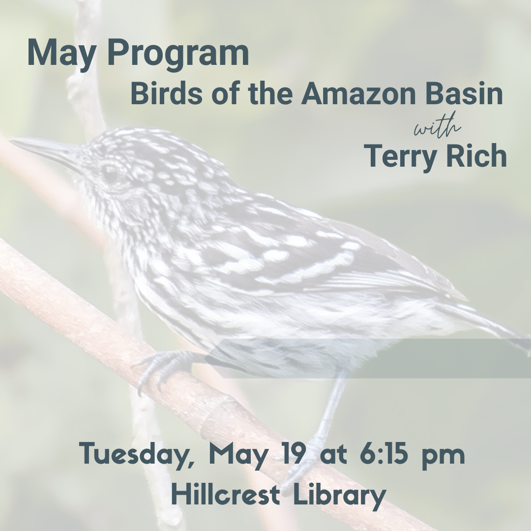 The Amazon Basin is one of the most renowned birding destinations on earth, with over 1300 bird species. Terry has birded the Amazon eight times - three times in Brazil, two times in Peru, and once each in Venezuela, Ecuador, and Colombia. He will cover some of the region's most amazing birds, along with observations on travel, people, food, and accomodations. What makes a great Amazon destination? How do you prepare? Come and find out on May 19!
