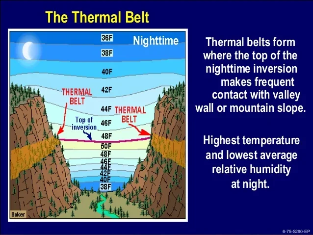 The middle third of the slope can play a unique role in some years. At night, the air cools and typically moves downslope to the lower third and down the drainage. The warm air readily moves off the upper third of the slope. However, in inversions, the warm air can become trapped between the cooling upper slope and the already cooler lower slope, creating what is called a thermal belt. Normally at night, firefighters expect the fire to slow down and not spread as rapidly due to cooling conditions, but that does not happen in the thermal belt.