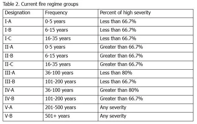 Several approaches to describing fire regimes have been developed over the years; LANDFIRE fire regimes are the accepted approach used by the federal, state, and tribal governments to describe fire regimes. The original LANDFIRE fire regime descriptors consisted of five broad groups (Table 1). Fire regimes I, III, IV, and V described forest fire regimes and all other vegetation types were lumped into Fire Regime II.